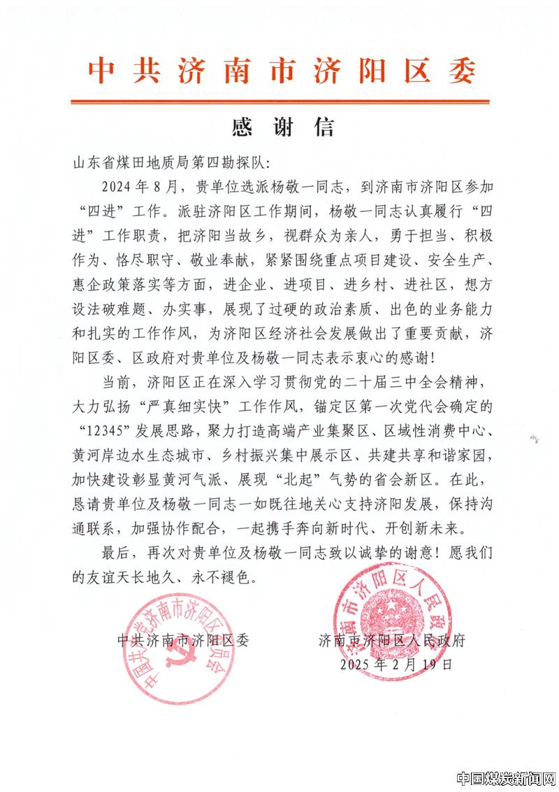 【本网讯】近日,山东省煤田地质局四队收到中共济南市济阳区委、济南市济阳区人民政府发来的感谢信,感谢四队派驻省“四进”济阳支队的杨敬一同志为济阳区经济社会发展作出了重要贡献。![]() 杨敬一同志2024年8月参加“四进”工作以来,时刻牢记全心全意为人民服务的宗旨,认真履行工作职责,期间担任济阳支队安全组组长,负责安全生产督导服务工作,共完成11次安全专项督导,督导基层单位155家,提交督导报告11份,提报问题隐患180余项,并积极联系责任部门推进问题整改。其过硬的政治素质、出色的业务能力和扎实的工作作风,得到了当地区委、区政府和干部群众的认可与赞誉。 下一步,山东省煤田地质局四队将继续为“四进”攻坚行动做好支持保障工作,选派优秀党员干部投身地方经济社会建设,以更加坚定的信心、更加饱满的热情,践行省属公益事业单位社会担当。