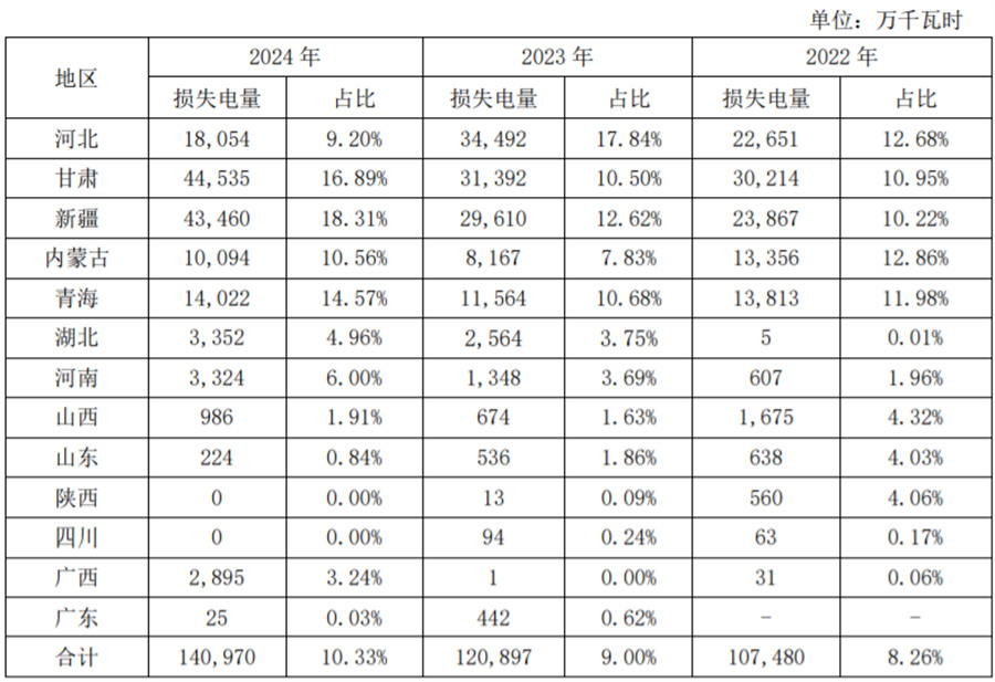 近日,中广核新能源、华能国际、华润电力、节能风电与大唐发电纷纷发布自身2024年年报,根据年报显示,大多数风电开发企业正因弃风限电导致的设备利用率下降,使业绩受到影响。 3月25日,中广核新能源发布截至2024年12月31日止年度全年业绩。2024年,该公司归母净利润为2.48亿美元,同比下降7.3%。 在提到中国的风电项目时,年报指出,年内收入减少主要由于风电项目的发电量减少。由于2024年的限电同比增加,风电项目的平均利用小时较去年减少。整体而言,年内经营溢利减少至344.7百万美元。 华能国际的财报显示,该公司2024年实现营业收入2455.51亿元,同比下降3.48%;归属于上市公司股东的净利润为101.35亿元,同比增长20.01%。截至2024年末,公司风电装机容量为18109兆瓦,全年风电税前利润汇总金额为67.72亿元,同比增加8.59亿元。2024年,公司新增风电机组可控发电装机容量2645.75兆瓦。 年报显示,2024年华能国际风电利用小时2295小时,同比下降33小时。 华润电力发布年度业绩,集团营业额1052.84亿港元,同比增长1.9%;股东应占溢利143.88亿港元,同比增长30.8%。报告指出,由于中、东和南部地区的风光项目建设制约因素较多,2024年新并网风电为3646兆瓦,获得风电开发建设指标7652兆瓦。 报告强调,2024年,华润电力附属风电场平均利用小时为2331h,较2023年下降120h或4.9%,超出全国风电机组平均利用小时204h。 节能风电2024年度报告显示,该公司报告期实现营业收入50.27亿元;归属于上市公司股东的净利润13.3亿元。截至2024年12月31日,公司实现风电累计装机容量6177.66MW,权益装机容量5943.36MW。 2024年公司因弃风限电损失电量14.1亿千瓦时,新疆(18.3%)、甘肃(16.9%)、青海(14.6%)成重灾区。全国新能源消纳趋紧背景下,部分地区电网调节能力不足,导致风电场被迫降发。 “弃风限电”是影响公司经营业绩最主要的因素之一,2022年至2024年,公司受到“弃风限电”影响所间接损失的发电量情况如下: ![]() 2022年至2024年,公司因“弃风限电”所损失的潜在发电量分别为107480万千瓦时、120897万千瓦时、140970万千瓦时,分别占当期全部发电量(即实际发电量与“弃风限电”损失电量之和)的8.26%、9.00%、10.33%。 大唐发电的年报显示,公司实现营业总收入1234.74亿元,同比增长0.86%,归母净利润45.06亿,同比增长229.70%。报告期内,公司新增风电项目2594.2兆瓦,风电项目核准容量2031.8兆瓦,风电在建项目装机1759.3兆瓦。截至2024年底,公司在役风电10058.69兆瓦。 在大唐发电的年报中,并未谈及该公司受弃风限电的影响,但在涉及行业背景情况说明时,年报提到了2024年,全国6000千瓦及以上电厂发电设备利用小时3442小时,同比降低157小时。并网风电2127小时,同比降低107小时;并网太阳能发电1211小时,同比降低81小时。 风电和太阳能发电设备利用小时同比下降,一方面是资源方面原因,2024年全国平均风速、全国水平面辐照量均同比下降;另一方面是部分地区风电和太阳能发电利用率同比下降。 根据能源局发布的相关数据,2024年全国风电利用率为95.9%,河北、蒙西、蒙东、辽宁、吉林、黑龙江、陕西、甘肃、青海、新疆、西藏区域低于全国平均水平,弃风问题突出。 2025年1月份,全国风电利用率为94.8%,其中北京、河北、山东、蒙西、蒙东、吉林、陕西、甘肃、青海、新疆、广西等区域,风电利用率低于全国平均水平。弃风限电问题开始由西北风资源富集区向华北、西南风资源一般的区域扩大。