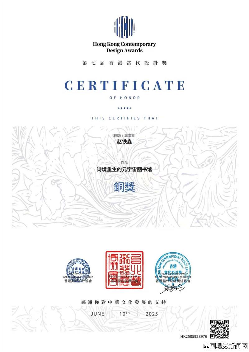 题记:2025年6月,冀中能源邯矿集团原郭二庄矿职工赵增喜再次迎来一个高光时刻,儿子赵铁鑫的空间设计作品“学域核心——未来校园图书馆”荣获西班牙ROCA美术馆、巴塞罗那“人文艺术研究院”联合颁发的设计银奖;“诗境重生的元宇宙图书馆”,获得第七届香港当代设计奖(HKCDA)铜奖。![]() 这场国际级赛事由西班牙ROCA美术馆与巴塞罗那“人文艺术研究院”共同举办,吸引了全球5万多名参赛者。作为全球知名的艺术殿堂,西班牙ROCA美术馆与巴塞罗那“人文艺术研究院”始终致力于探索空间设计的视觉创新呈现方式。
