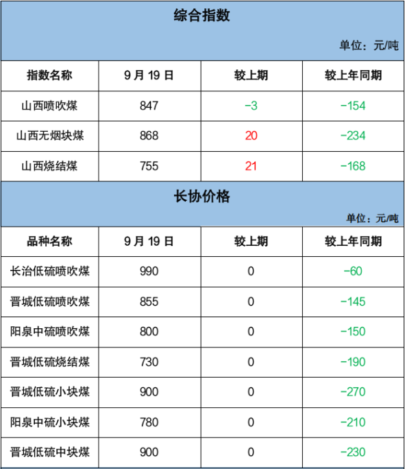 ※市场概述 山西地区无烟煤市场偏强运行。块煤市场方面,本周尿素市场偏弱运行,煤头装置开工率从8月中旬起连续下降的情况下首次实现由降转升,临近国庆假期,下游化工企业备煤需求逐渐释放,对原料煤采购有一定积极性,叠加民用需求仍有所增长,以及动力煤市场偏强运行,对无烟块煤市场需求端有较好支持。晋城、阳泉地区块煤市场价环比涨33-66元/吨左右,同比跌167-253元/吨。截至9月19日,无烟小块坑口含税价格在780-932元/吨之间。 末煤市场方面,钢材市场震荡偏强运行,铁水产量、高炉开工环比持续提升,钢厂利润尚可,节前备煤需求有所增加,对原料煤采购较为积极,贸易商、洗煤厂等中间环节参与活跃度较高,叠加炼焦煤市场偏强运行,带动冶金用末煤市场偏强上涨。长治地区喷吹煤市场价环比涨65元/吨,同比跌185元/吨;晋城地区烧结煤市场价环比涨35元/吨左右,同比跌154元/吨。截至9月19日,喷吹煤坑口含税价格在825-915元/吨之间。 港口方面,日照港晋城喷吹煤价格环比持平,同比跌145元/吨。日照港、京唐港进口喷吹煤价格环比涨15元/吨,同比跌60-90元/吨不等。 ![]() ![]() 一、中国太原煤炭价格指数 ![]() 二、卓创资讯价格 ![]() 三、CCTD中国煤炭市场网价格 ![]()