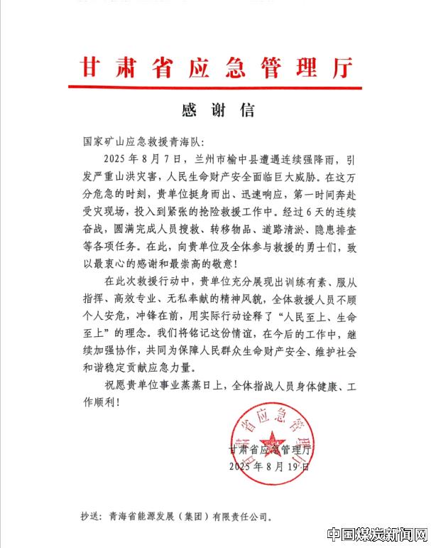 | 甘肃省应急管理厅发来感谢信 对青海能源集团公司矿山救援大队在“8·7”抢险救援中突出贡献致信感谢 | |||