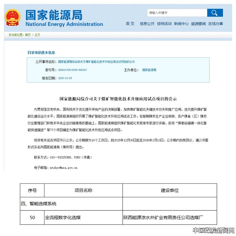 【本网讯】近日,国家能源局综合司公布煤矿智能化技术升级应用试点项目,陕西能源凉水井矿业有限责任公司《全流程数字化选煤》项目成功入选,标志着公司选煤智能化建设成果获国家级认可。 ![]() 凉水井矿业智能化选煤厂建设立足行业发展趋势,从基础平台、基础自动化、智能控制、智能管理决策四大维度统筹规划、系统推进,将传感监测、大数据、人工智能等前沿技术深度融入选煤厂底层控制、分选流程及生产管理全链条,构建起“全域感知、全局协同、全线智能”的洗选管理体系,实现智能运输、智能分选、智能压滤、智能润滑、智能加药、智能仓储、智能销售等环节的全过程智能化运行。同时融入虚拟数字人与deepseek大模型,实现人与数据动态交互及生产信息智能分析。 2026年,凉水井矿业将紧扣国家能源局及集团公司“人工智能+”发展要求,持续深化“人工智能+生产建设”融合应用。重点优化选煤厂deepseek大模型,推动生产数据分析向辅助决策升级,实现介质密度、设备运行参数的精准调控;以试点项目建设为契机,深入推进全流程数字化、智能化选煤厂建设,提升选煤生产效率与智能化水平,为企业高质量发展注入新动能。