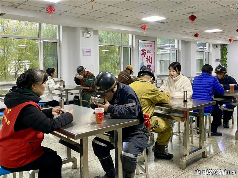 图为近日,家属在职工班后食堂里面陪刚上井的亲人用餐