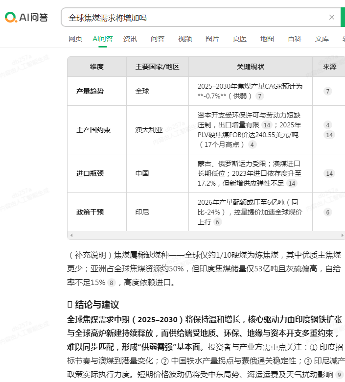 . 中国焦煤近几年煤质(从原煤到精煤的洗出率)以年均1%的速度下降,由2022年的37.4%降至2024年的35.5%;4.CAGR预计2025年至2030年全球焦煤产量以年均0.7%的速度下降;5.中东乱局拉高全球煤炭价格