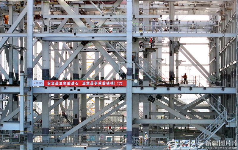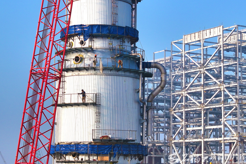 2025年10月24日,中国石油新疆油田煤电联营一体化项目煤电工程的锅炉钢架搭设完成。张珏摄 该项目于2024年8月开工建设,分两期实施。其中,一期建设264万千瓦光伏,配套2台66万千瓦超超临界燃煤发电机组,以及一套年处理能力100万吨的二氧化碳捕集装置。 项目涵盖三大核心工程,以煤电为基、新能源为翼、碳捕集为纽带,着力构建全产业链低碳发展模式。目前,项目一期煤电工程的主厂房已顺利封顶,间冷塔、烟囱等标志性主体建筑进度均已过半;新能源工程中的264万千瓦光伏组件安装已全部完成;碳捕集工程的三塔主体、电控楼主体及厂房等关键设施已完成组装,施工重点已转向三塔内件安装、管廊架钢结构及附件安装等。
